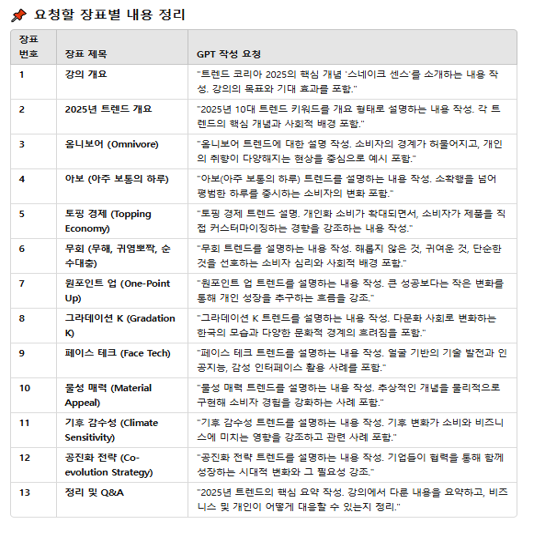 장표별 주요 내용을 요약해 준것을 입력하고 생성 요청을 하기만 하면 된다.