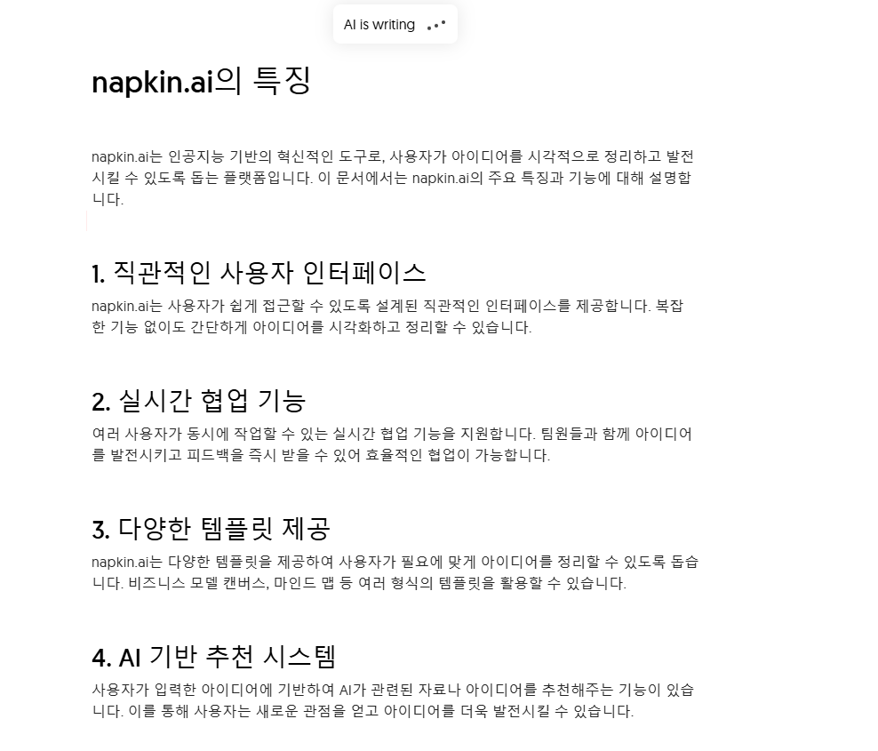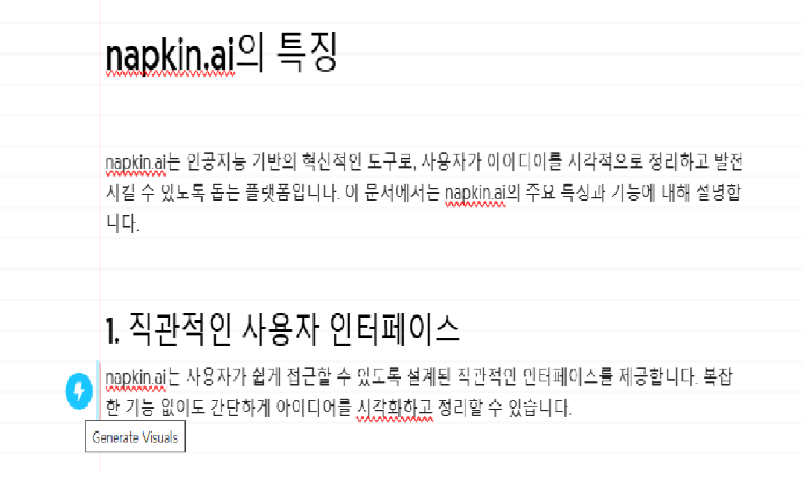 질문으로 napkin.ai의 특징에 대해 알려달라고 질문을 했습니다.