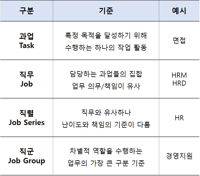 직무는 유사한 업무들을 수행하는 단위입니다. 직무별로 수행하는 업무는 회사별로 다르게 구분하게 됩니다. 일반적으로 HRM, HRD가 직무에 해당합니다. 또한 이 단위의 직무가 가장 많이 접하게 되는 구분 단위 입니다. 이 글의 주제역시 이 직무에 대한 설명을 위해 시작되었습니다. 본인이 채용을 희망할 때의 일차적인 지원의 단위가 됩니다.