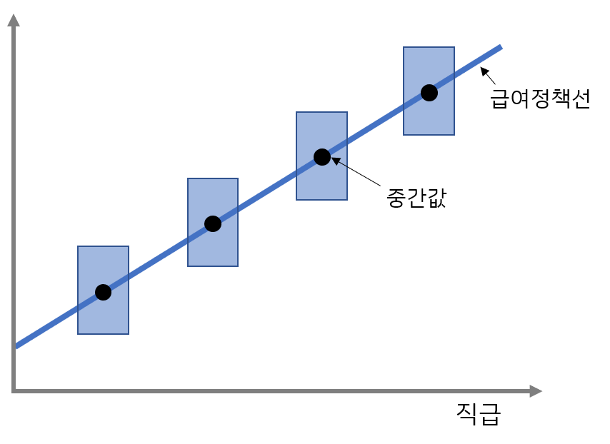 직급별로 기본급의 최고, 최저 수준이 있습니다. 직급별 급여의 최솟값에서부터 최댓값 까지를 페이 밴드라고 합니다. 최댓값은 해당 직급에서 수령할 수 있는 연봉의 상한선입니다. 상한 선에 도달한 경우에는 연봉 인상이 더 이상 없으며 상위 직급으로의 승진을 해야 연봉 인상이 가능하게 됩니다. 최솟값은 해당 직급에서 받게 되는 연봉의 하한선입니다. 하위 직급에서 승진한 경우 또는 신규 입사자의 경우가 주로 해당됩니다.