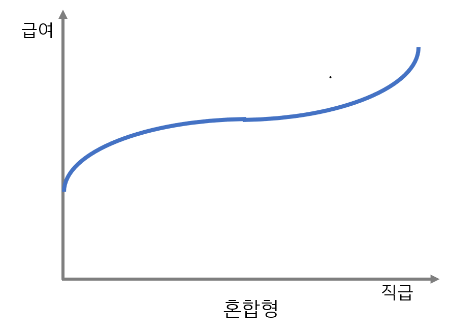 예를 들어 혼합형으로 체증형과 체감형으로 동시에 사용할 수 있습니다. 신입 초임을 높게 설정하여 신입직원의 유입을 촉진할 수 있습니다. 그리고 중간 직급의 임금 상승률은 낮게 설정하여 임금에 대한 부담을 줄이고 상위 직급에서는 다시 임금 상승률을 높여 직급 상승에 대한 동기부여를 하는 방법이 있습니다.