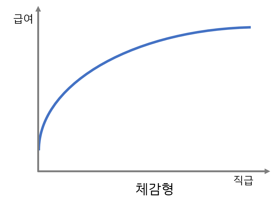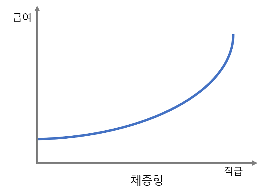 기울기가 큰 체증형은 상위직급으로 갈수록 임금 증가율이 상승하게 되는 임금정책입니다. 상위 지급의 인원이 소수이며 근무 기간에 따라서 업무에 대한 숙련도가 상승하여 조직에 대한 기여도가 상승한다고 가정한 임금정책으로 전문직에 적합한 정책입니다. 직급이 올라갈수록 임금 상승률이 감소하는 체감형은 근속연수가 증가할수록 조직에 대한 기여도가 감소하거나 큰 변화가 없다는 가정함 임금정책으로 단순 업무를 하는 직무에 적합한 정책입니다.