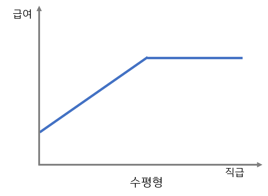 가장 단순한 형태로 보이는 기울기가 일정한 상승형이 있습니다. 이는 재직연수에 비례하여 임금이 상승하는 모델에 해당하는 연공형 임금정책으로 고용이 안정적이고 근무 연한에 따른 임금 상승이 예측되는 경우에 이 모델을 적욜할 수 있습니다. 임금이 일정 수준까지는 상승하나 그 이상의 상승은 막는 수평형은 임금 피크제 또는 직급별 임금의 상한선을 정해 놓은 경우에 해당할 수 있습니다.