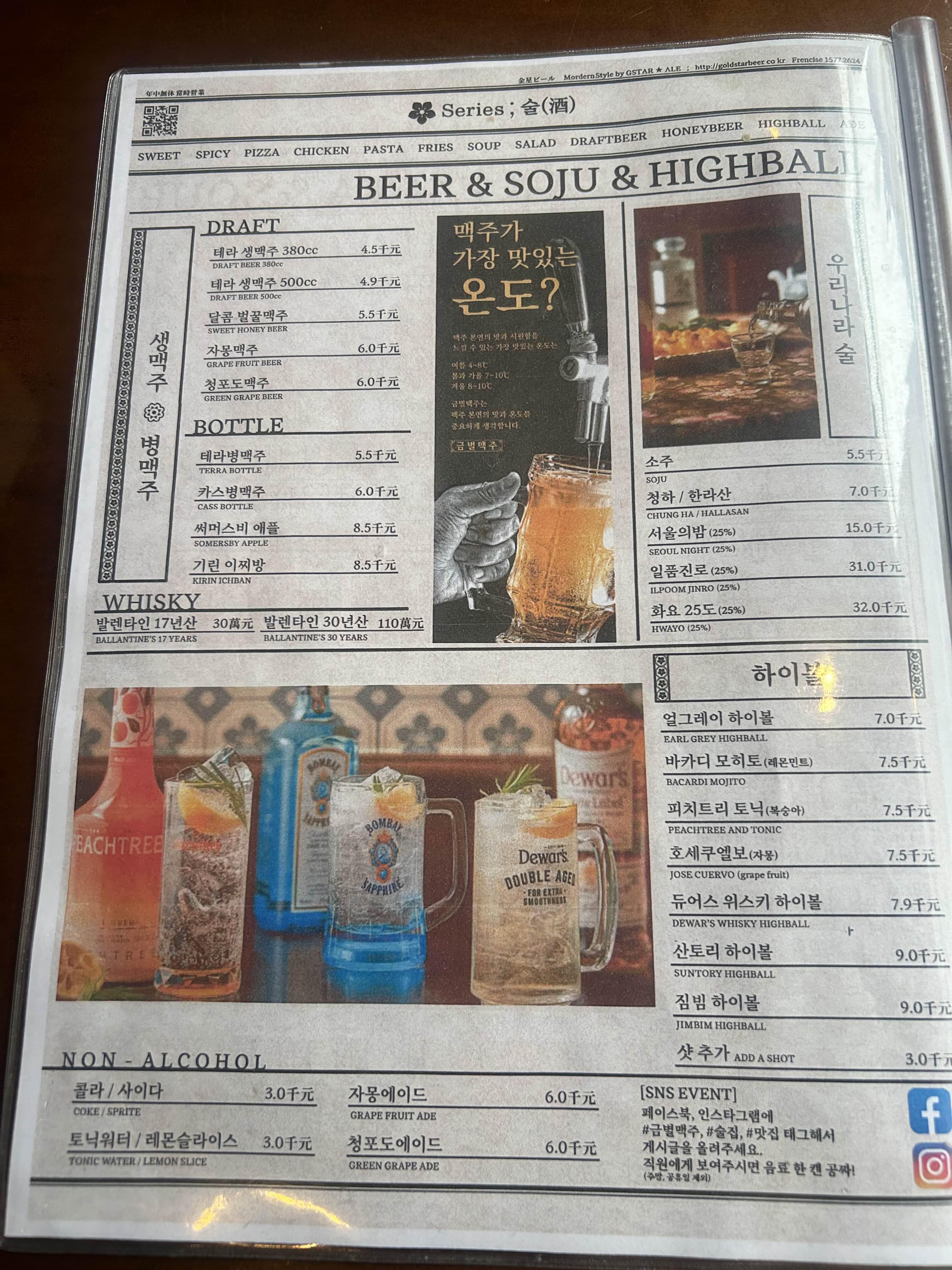 메뉴는 다양한 종류의 맥주와 안주가 준비되어 있는데, 특히 아이들과 함께 온 부모님들을 위해 알코올이 없는 맥주와 다양한 음료들도 구비되어 있습니다. 아이들이 좋아하는 음료와 간식도 있어서, 부모님들과 함께 식사를 즐길 수 있습니다. 또한 안주로 피자와 간단한 파스타 등도 있어서 아이들의 입맛에도 잘 맞습니다.