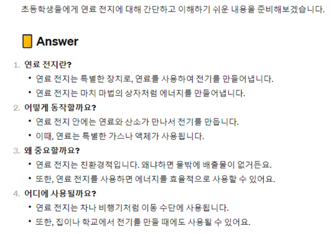 처음에 예시로 들었던 연료전지에 대한 설명은 어떻게 차이가 날지 확인해보면 다음과 같다.