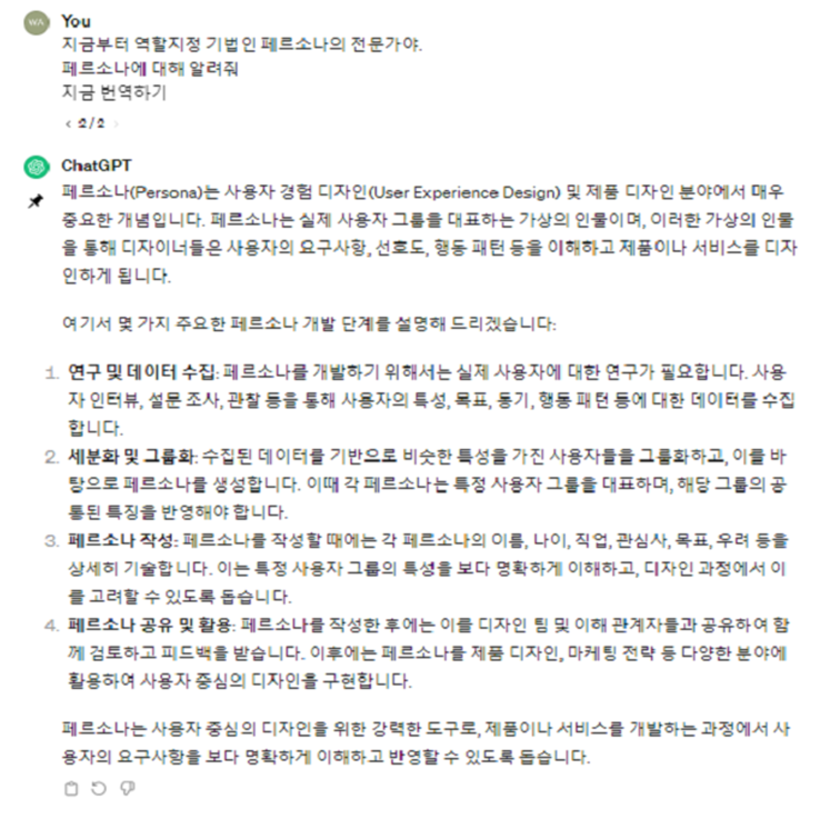 무언가에 대한 내용의 확인을 하려고 한다면 전문가로서의 페르소나 부여는 내용의 정확도 확보를 위한 가장 간단한 방법이 될 것이다.