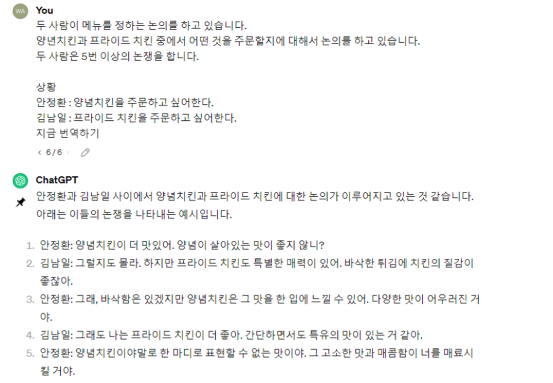 대화의 상황을 지정하고 끝내는 것으로는 대본으로 활용을 할 수 있는 방식이 될 것이다. 대본으로 활용을 한다면 보다 더 자세한 상황과 캐릭터의 성격을 입려해서 보다 원하는 내용이 출력될 수 있도록 할 수 있을것이다.