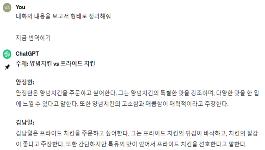 예시의 대화 내용이 길지는 않지만 보고서 양식으로 정리를 한다면 위와 같이 될 수 있다. 양식은 필요한 양식으로 지정을 하면되며 치킨 논쟁의 경우, 대화의 양이 5개로 제한적이라 보고서도 간단하게 나오지만 논쟁의 내용이 긴 경우에는 아주 효과적으로 사용할 수 있을 것이다. 추가로 논쟁의 주제가 익숙하지 않은 분야의 경우에도 LLM을 활용하면 요약까지는 어렵지 않게 할 수 있게 된다.