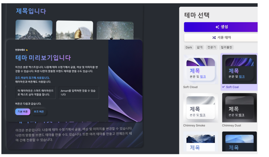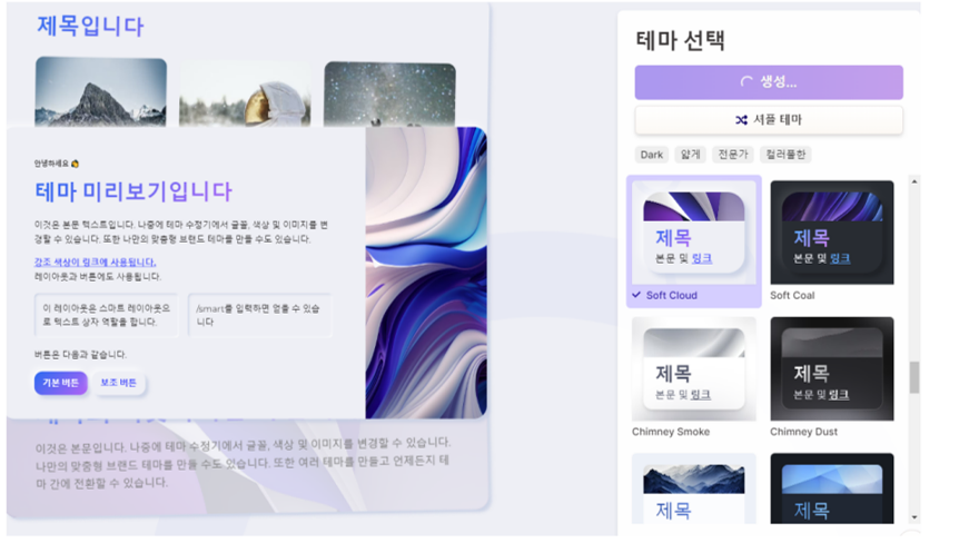 여기까지 선택을 해준 다음에는 전체 테마를 선택하는 단계로 넘어가게 됩니다. 장표를 상세하게 미리 확인하지는 못하며 메인 테마 장표를 확인하면서 선택할 수 있습니다. 여러가지를 보면서 선택을하면 되며 생성 이후에도 테마는 변경을 할 수 있습니다.