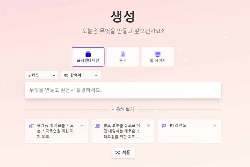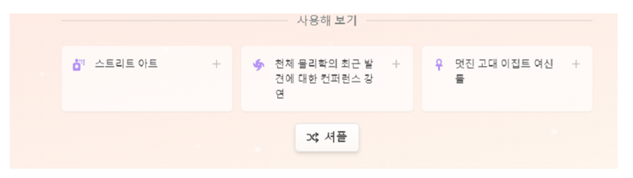 하단에서는 주제의 샘플 제공을 하고 있어서 작성할 아이디어가 떠오르지 않는다면 활용해 볼 수 있는 주제를 제공하고 있습니다. 셔플 버튼을 클릭하면 다른 주제들을 보여줍니다.