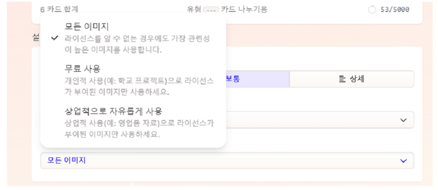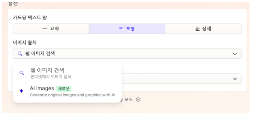 기본 세팅은 웹이미지 검색이며 AI images로 선택을 할 수 있습니다. 여기서의 주의점은 AI images를 사용하게 되는 경우, 추가 Credit 차감이 있을 수 있다는 점만 확인 후에 사용을 하시면 되겠습니다. 웹이미지 사용은 기본 세팅이며 추가 차감은 없습니다.