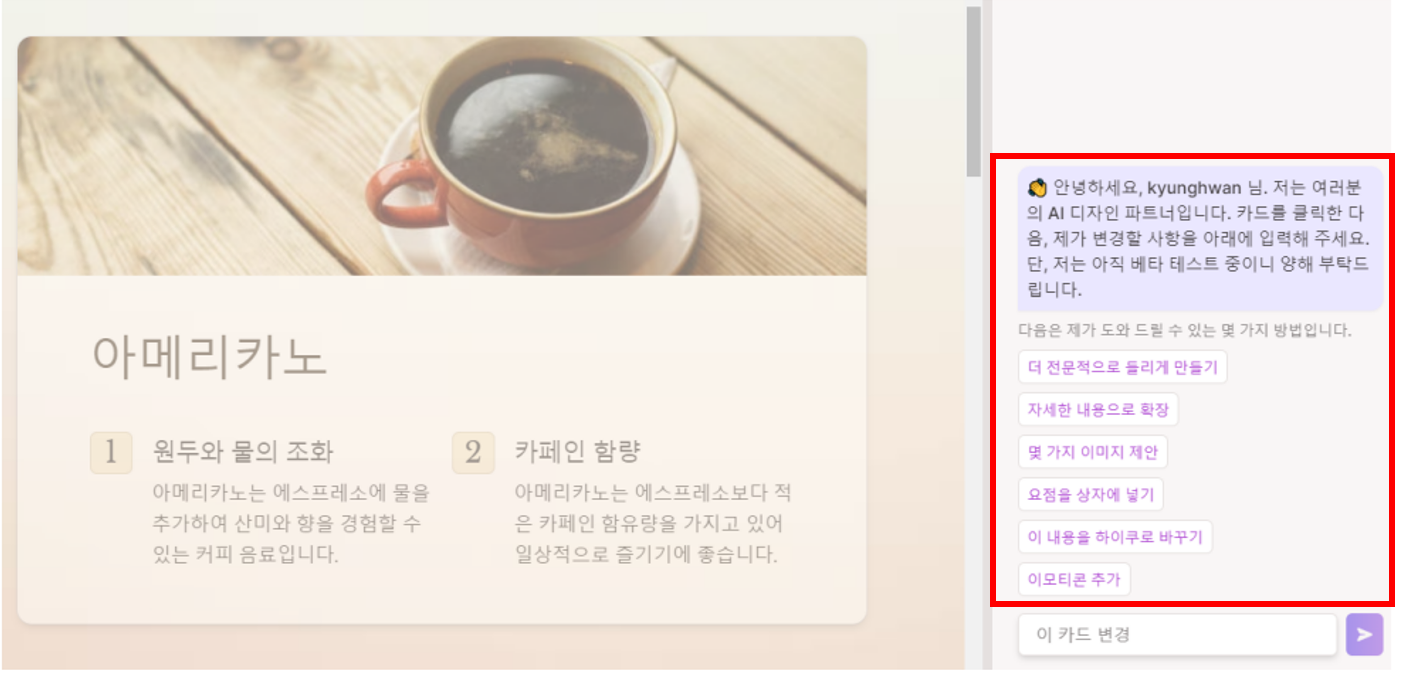 'AI로 수정'을 클릭하면 우측의 메뉴 화면이 아래처럼 변경되게 됩니다. 채팅창이 나오게 되며 원하는 수정 사항을 질문 처럼 요청할 수 있습니다. 먼저 제안을 해주는 수정 방식도 보여주고 있습니다.