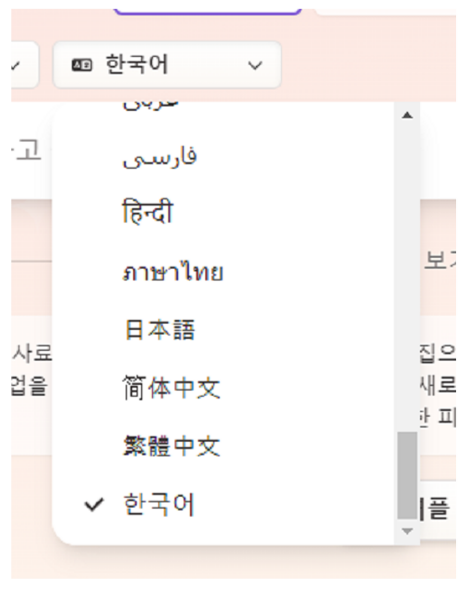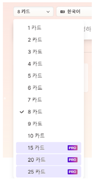 주제 선택 상단에는 생성하려는 카드(화면)의 수와 언어를 선택할 수 있습니다. 무료 버전에서는 최대 10장까지를 생성할 수 있습니다. 그 이후의 자료는 유료 버전으로 업그레이드 이후에 사용할 수 있습니다. 언어는 한국어로 세팅이 되어 있으나 많은 수의 언어를 지원하고 있습니다.