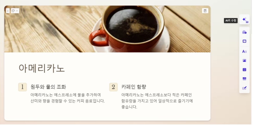 추가적인 수정을 원한다면 다양한 방법으로 수정이 가능합니다. 그 중에섯 Gamma만의 수정 방법이 있습니다. 바로 AI로 수정하는 방법입니다. 수정을 원하는 화면을 선택하고 우측의 메뉴 바에서 'AI로 수정'을 선택합니다.