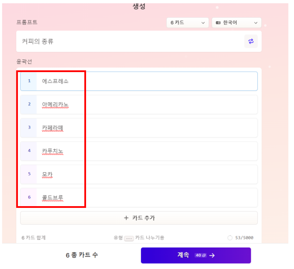 '커피의 종류'라는 주제 하에 카드수를 입력한 대로 6개의 커피 종류에 대한 주제를 선정을 했습니다.