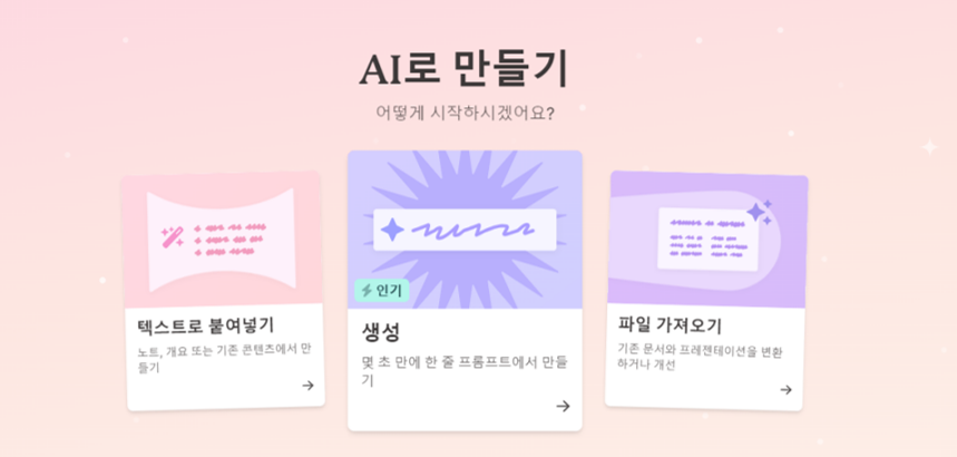 중앙 상단의 '새로만들기' 버튼을 클릭해서 PPT 만들기를 시작할 수 있습니다. 클릭하면 만들기 시작을 위한 아래의 화면으로 이동을 하게 됩니다. 텍스트, 생성, 파일 가져오기 세가지가 있고 이 중에서 가운데의 '생성' 배너를 클릭하면 됩니다.