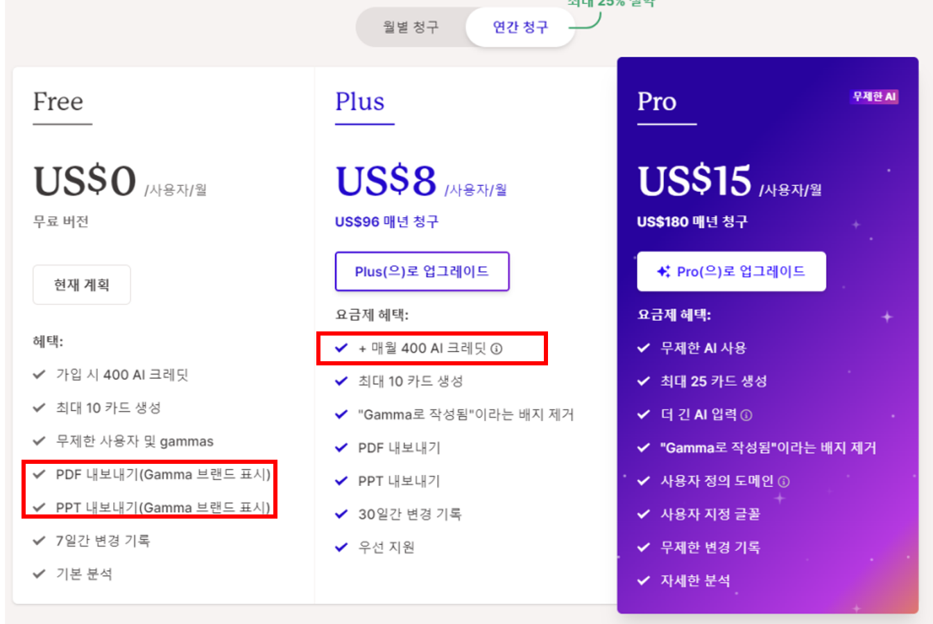 요금제는 3가지가 있습니다. 무료, Plis, Pro 무료는 첫 가입자의 체험판 같은 경우 입니다. 400Credit을 사용하면 더이상 사용할 수 없게 됩니다. Plus 요금제는 매월 400credit을 사용할 수 있어서 월에 2~4개 정도를 생성할 수 있는 요금제 입니다.