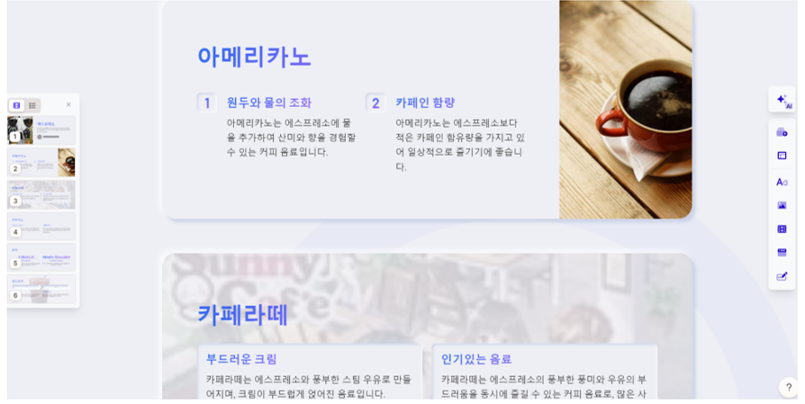 생성 대상은 '프레젠테이션', 카드수는 6, 언어는 한국어로 선택을 해주고 주제는 '커피의 종류'로 선택을 했습니다. 그리고 개용 생성 버튼을 클릭하면 됩니다.