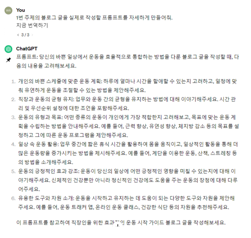자세한 상황을 가정하지는 않았지만 블로그 글을 작성하기 위한 Prompt를 위와 같이 작성해준다. 직접 작서하지 않고도 어느정도 정확한 내용이 들어있는 Prompt를 만들어 낼 수 있다.
