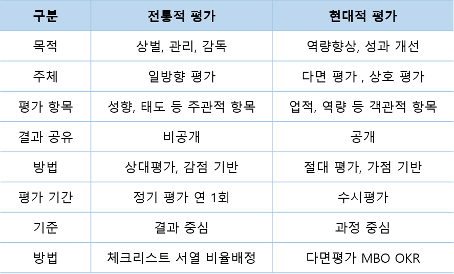 현대적 평가는 목적 자체가 달라지게 된다. 최우선 적인 목표는 회사의 성과이며 이를 위해서 개인의 역량 향상과 개인의 성과 개선을 목적으로 한다. 지금 수행하는 업무의 성과를 개선하기 위해 필요한 것은 무엇인지, 문제가 되는 것은 무엇인지 그리고 성과를 위해 필요한 역량 향상은 어떻게 할 것인지가 평가의 목적이다.