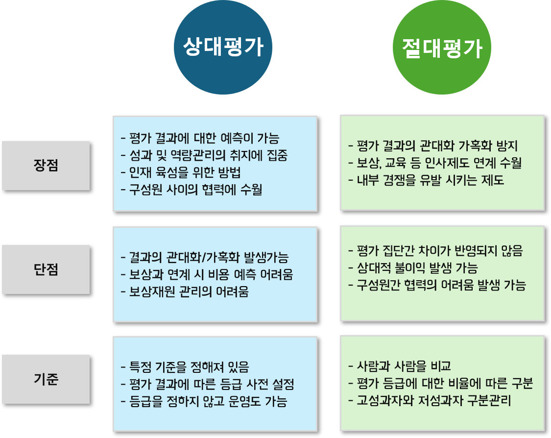 상대평가는 사람과 사람을 비교하는 방식이다. 평가 등급을 정하고 각 등급별 비율을 정확히 적용해서 최종 결과에 따른 등급을 부여한다. 고성과자와 저성과자 구분하고 결과에 대한 관리에 초점을 맞춘다. 이 방식에서는 가혹화나 관대화 같은 주관적인 요소를 방지할 수 있다. 보상, 승진 같은 다른 인사 제도에 활용하기도 용이하다. 보상과 연계가 되더라도 비용에 대한 예측을 할 수 있게 된다. 다만, 우수 집단에 속한 경우에는 상대적 불이익이 생길 수 있다. 반대의 경우도 발생할 수 있다. 집단 내에서 경쟁 구도이기 때문에 협력이 필요한 경우에 제한적이거나 이기적인 선택을 할 수 있다.