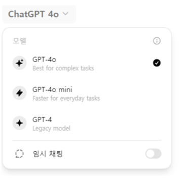 이렇게 유료 가입자는 GPT-4, GPT-4o, GPT-4O mini의 세가지 모델 중에서 선택하도록 변경되었다.