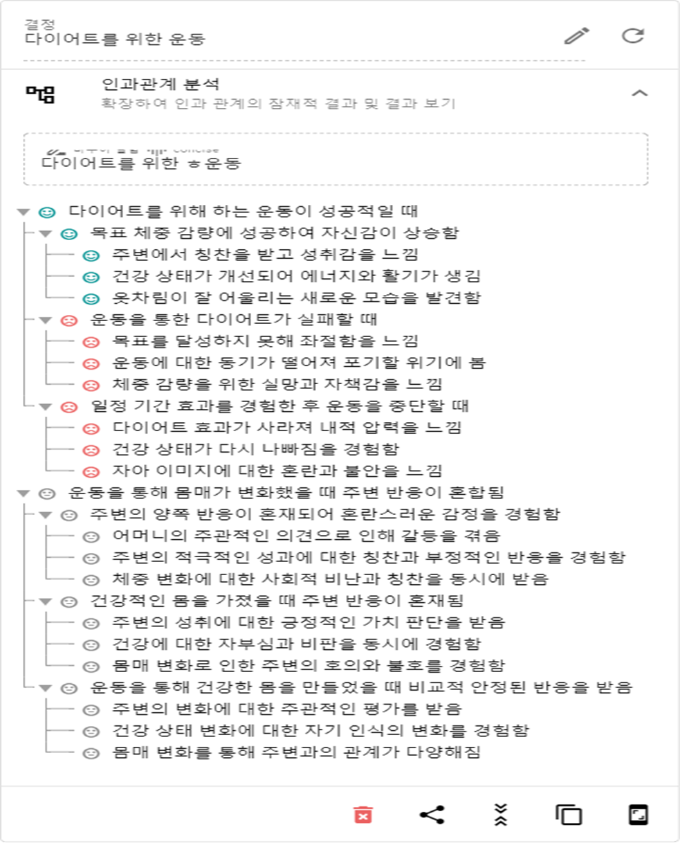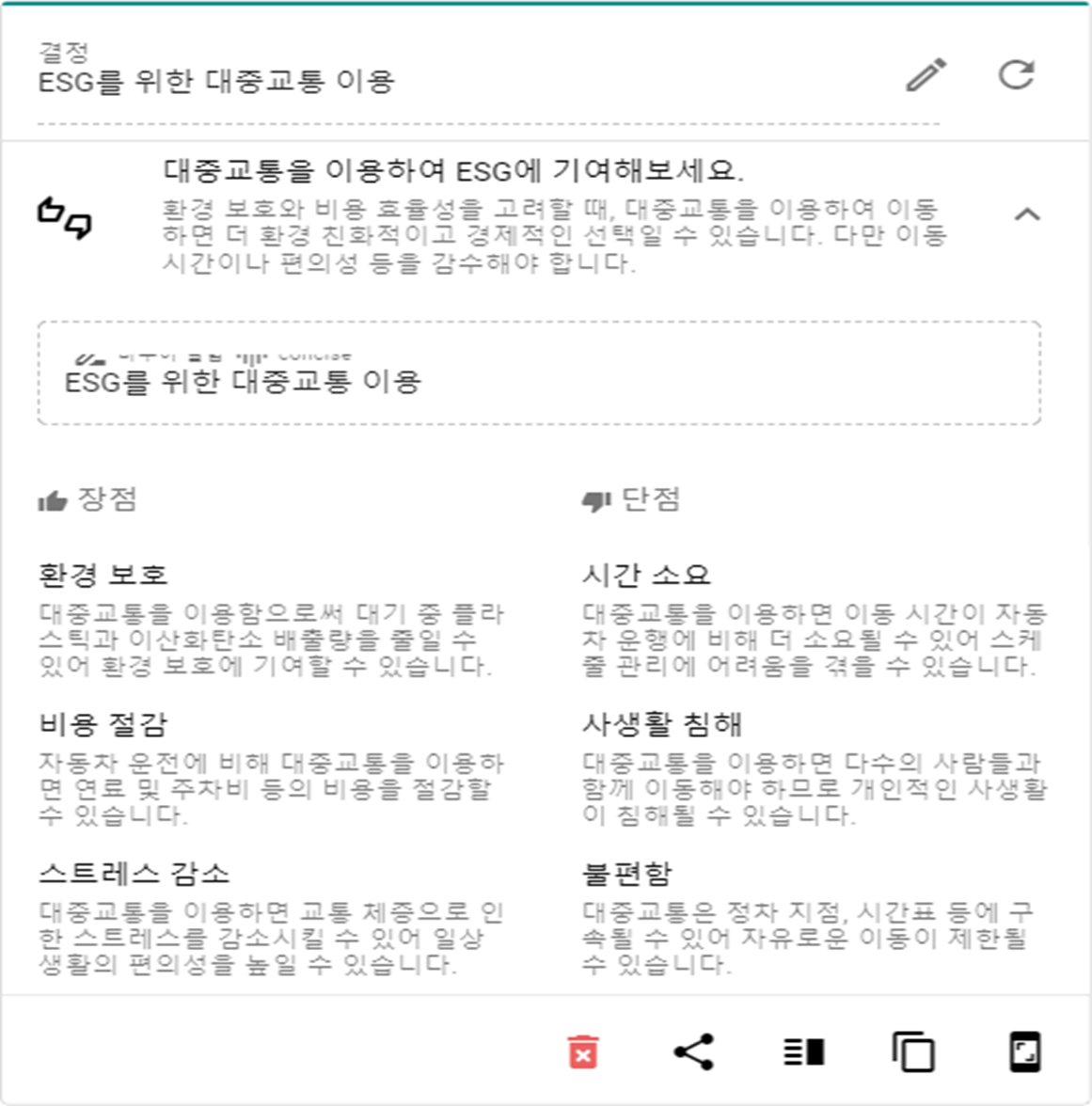 메인 화면에서 4가지 중에서 하나를 선택할 수 있다. 장단점, SWOT 분석, 다중 옵션, 인관관계 중에서 한가지 로직을 선택하여 진행할 수 있다. 질문은 하는 프롬프트 입력창에는 자세한 내용을 작성할 필요 업이 의사결정과 분석이 필요한 내용만 입력을 하면된다.