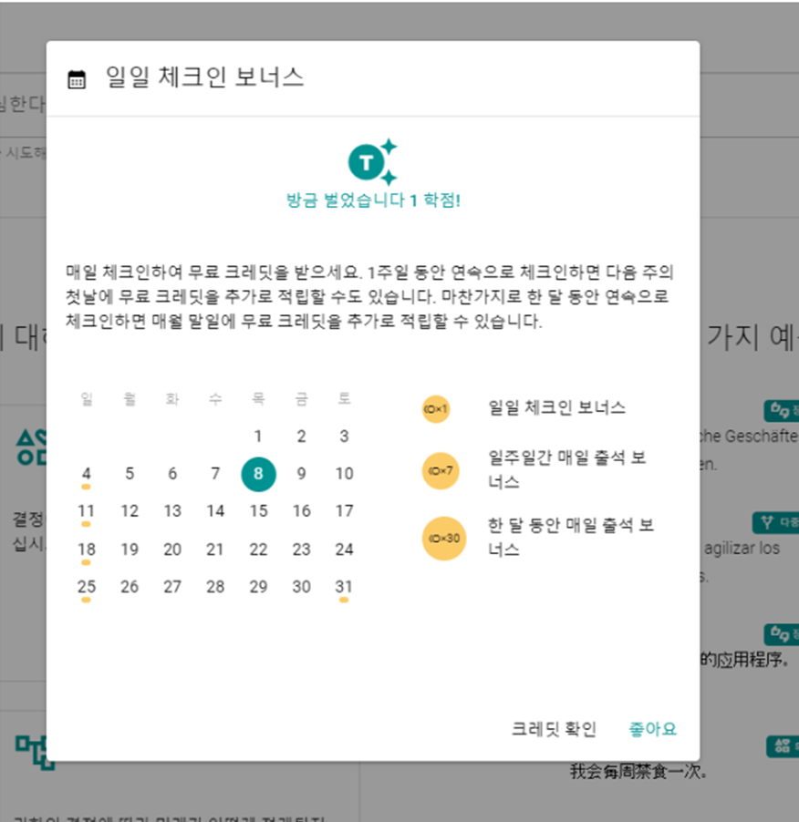 그 이후에 보이는건 일일 체크인 보너스 팝업창이다. 이 Tool은 크레딧 기준으로 사용을 할 수 있다. 물론 무료 요금제로 가입을 해도 처음에 사용해 볼 수 있을 정도의 크레딧은 받게 된다. 그리고서 이렇게 일일 체크인 등을 통해서 더 받을 수 있다.