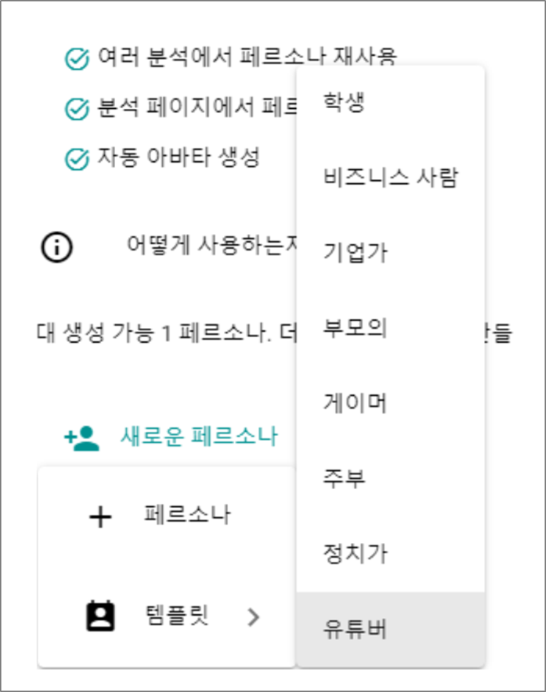 페르소나를 만들 때 '템플릿'을 선택하면 기본적으로 저장되어 있는 8가지 중에서 선택할 수 있다.