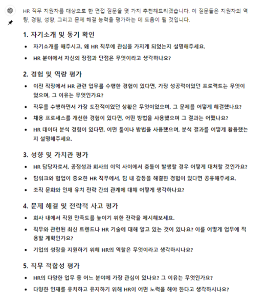 이럴 때 LLM을 활용해서 면접 준비를 보다 효율적으로 해볼 수 있다. HR직무를 신규로 채용할 때를 가정해서 면접 문항을 작성해보면 다음과 같이 해볼 수 있다.