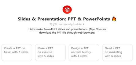 다음으로는 발표 장표를 만들어주는 APP들을 사용할 수 있는데 가장 접하기 쉬운건 GPTs를 통해서 제작하는 방법이다.