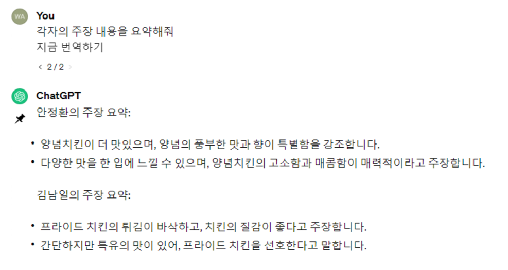 예시의 대화 내용이 길지는 않지만 보고서 양식으로 정리를 한다면 위와 같이 될 수 있다. 양식은 필요한 양식으로 지정을 하면되며 치킨 논쟁의 경우, 대화의 양이 5개로 제한적이라 보고서도 간단하게 나오지만 논쟁의 내용이 긴 경우에는 아주 효과적으로 사용할 수 있을 것이다. 추가로 논쟁의 주제가 익숙하지 않은 분야의 경우에도 LLM을 활용하면 요약까지는 어렵지 않게 할 수 있게 된다.