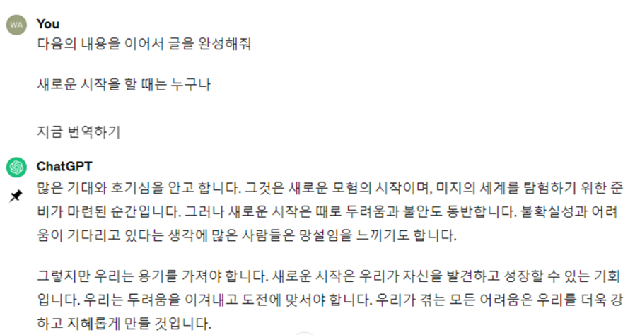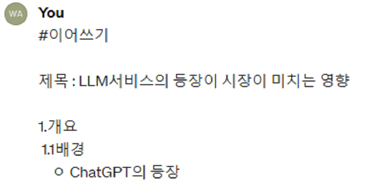 위와 같이 직접적으로 이어쓰기를 지시를 해주면 GPT가 주어진 일을 수행하는데 혼돈은 없을 것이다.