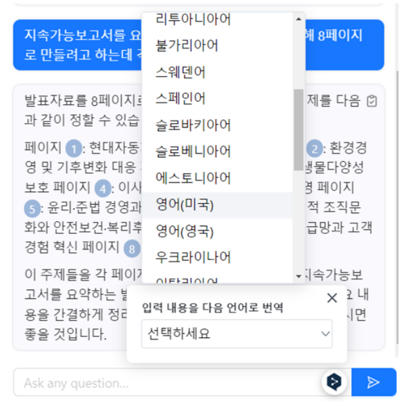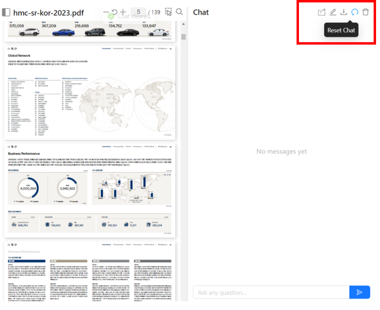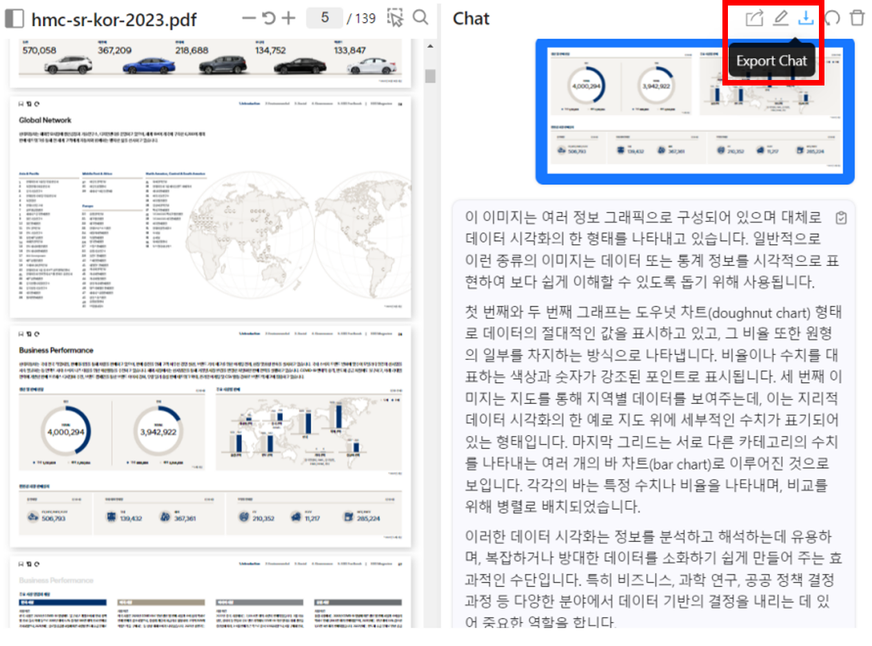 '현대자동차의 주요 사업을 알려줘'라는 질문을 해보았습니다.PDF 전반에 내용이 있지만 그 내용이 산재해 있어서 한번에 확인하기는 어려울것 같은 내용이어서 우선 질문을 해보았습니다. 해당 질문에 대해서 크게 4가지 주제로 나눠서 몇초안에 확인을 해줍니다. 직접했으면 몇시간이 걸렸을수도 있는 작업이 단 몇초만에 완료가 되었습니다.