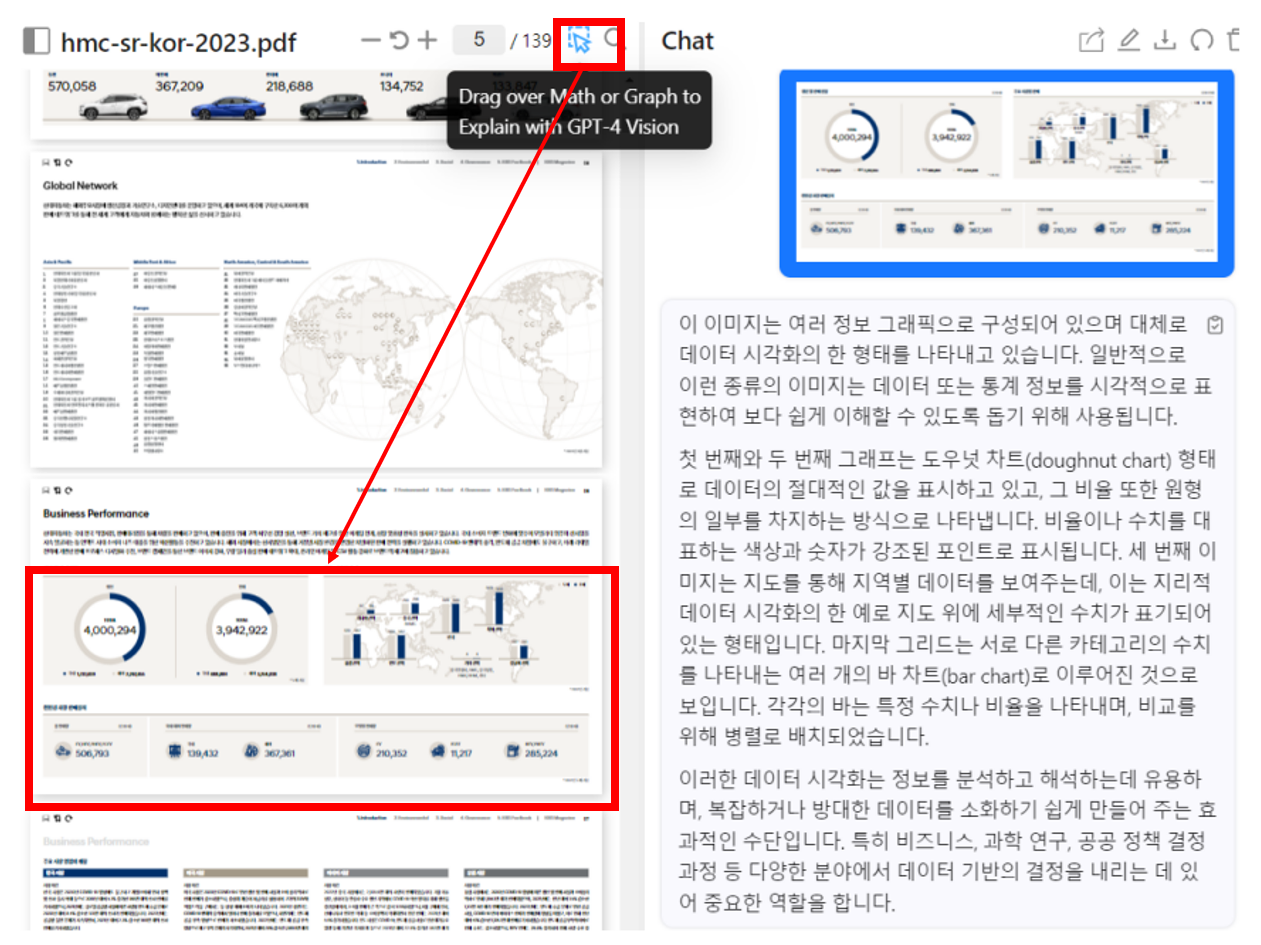 PDF 자료에는 그림이나 표가 다수 포함되어 있는 경우가 많이 있습니다. 화면 상단의 점선 박스를 클릭하고 분석을 원하는 그림을 클릭하면 그림에 대해서 설명을 해주기 시작합니다. 자세한 분석을 하기 힘든 경우, 데이터의 모양에 따른 종류와 분석을 위해 필요한 사항에 대해서만이라도 전달을 해줍니다. 아직은 모든 그래프나 그림에 대한 분석이 가능하지는 않은 상황입니다.