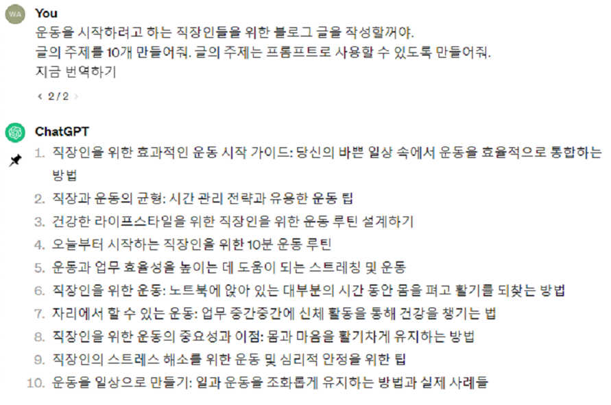 블로그 글을 작성하기 위해 주제의 선정 요청을 한다고 가정을 해보면 위의 상황과 같이 어렵지 않게 10개의 주제를 생성해 볼 수 있다. 정확히 원하는 주제가 아닌 경우에는 일부 추가 요청을 통해서 원하는 주제로 선정해 볼 수 있겠지만 예시의 상황이기 때문에 이정도에서 만족한다고 가정하고 다음 단계로 넘어갈 수 있다.